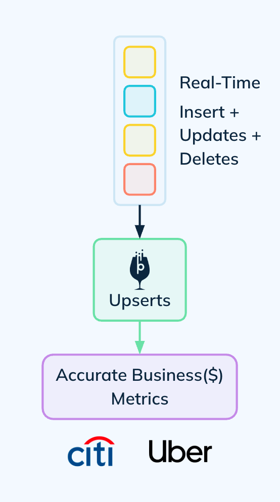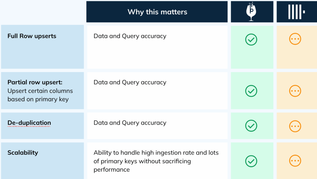 Why it Matters vs. ClickHouse: Pinot handles updates at ingestion time. When a record with an existing primary key arrives, it is updated in place, and the change is immediately visible to all subsequent queries. ClickHouse lacks a native synchronous upsert and relies on workarounds that either delay accuracy or harm query performance: