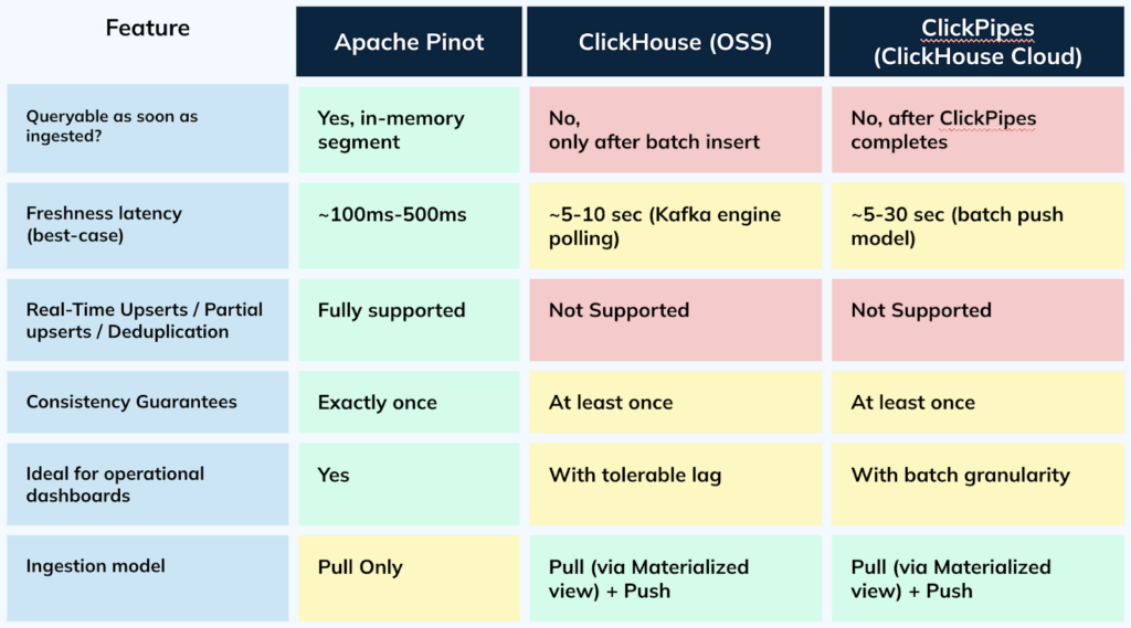ClickHouse’s real-time ingestion capabilities are an adaptation built upon a batch-optimized storage engine. This results in a micro-batch architecture that, while functional, forces a series of compromises in freshness, accuracy, and operational complexity that become increasingly problematic at scale.Apache Pinot’s stream-native, pull-based architecture is purpose-built for the demands of continuous real-time analytics. By prioritizing freshness by design, it eliminates the trade-offs inherent in systems that must buffer and eventually optimize data. It delivers millisecond-level data freshness, guaranteed exactly-once semantics, and highly scalable, synchronous upserts. For any organization building the next generation of data products where speed, scale, and accuracy are paramount, Pinot’s ingestion architecture is the superior and strategic engineering choice.