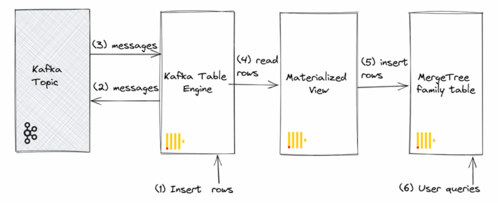 - A Kafka Engine Table: Acts as a transient view into a Kafka topic.