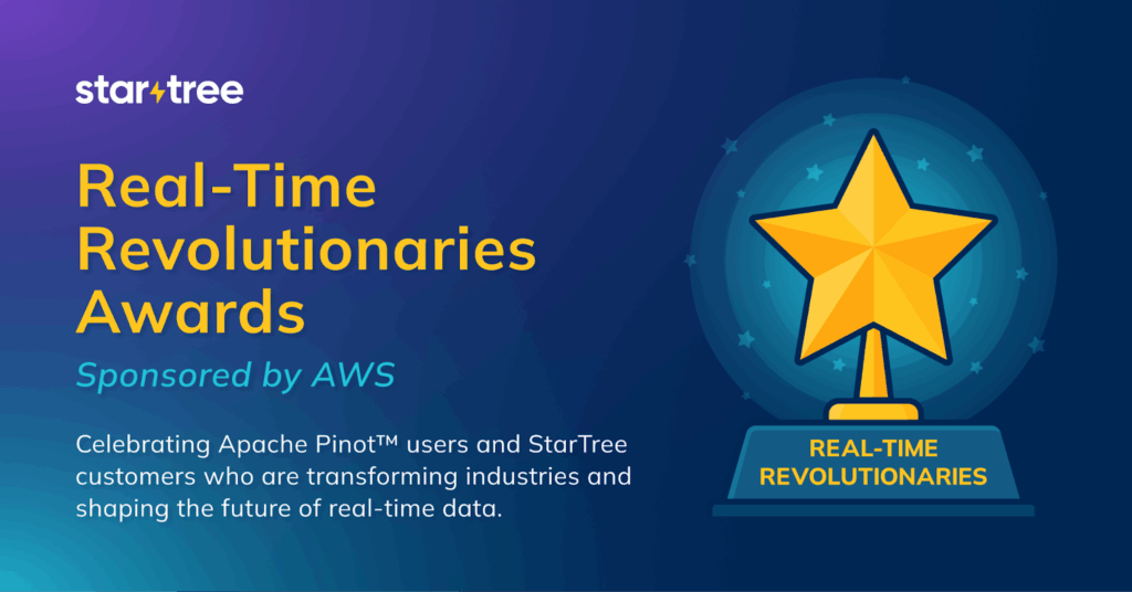 StarTree and Amazon Web Services (AWS) sponsored the inaugural Real-Time Revolutionaries Awards. These awards went to companies that are pioneers in adopting Apache Pinot and real-time analytics, changing their company, their industry, and the world at large. There was also one special award for the single greatest community contributor to the Apache Pinot open source software project. Award categories this year included the following: