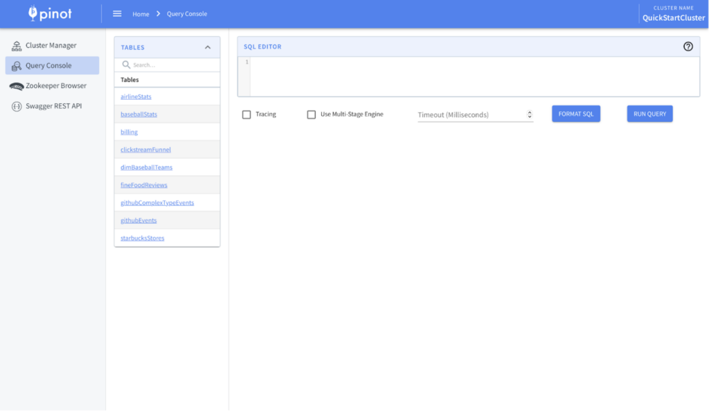 With the containers up and running you can now access the Pinot query console. Navigate to http://localhost:9000. Once there, click on “Query Console” on the left.
