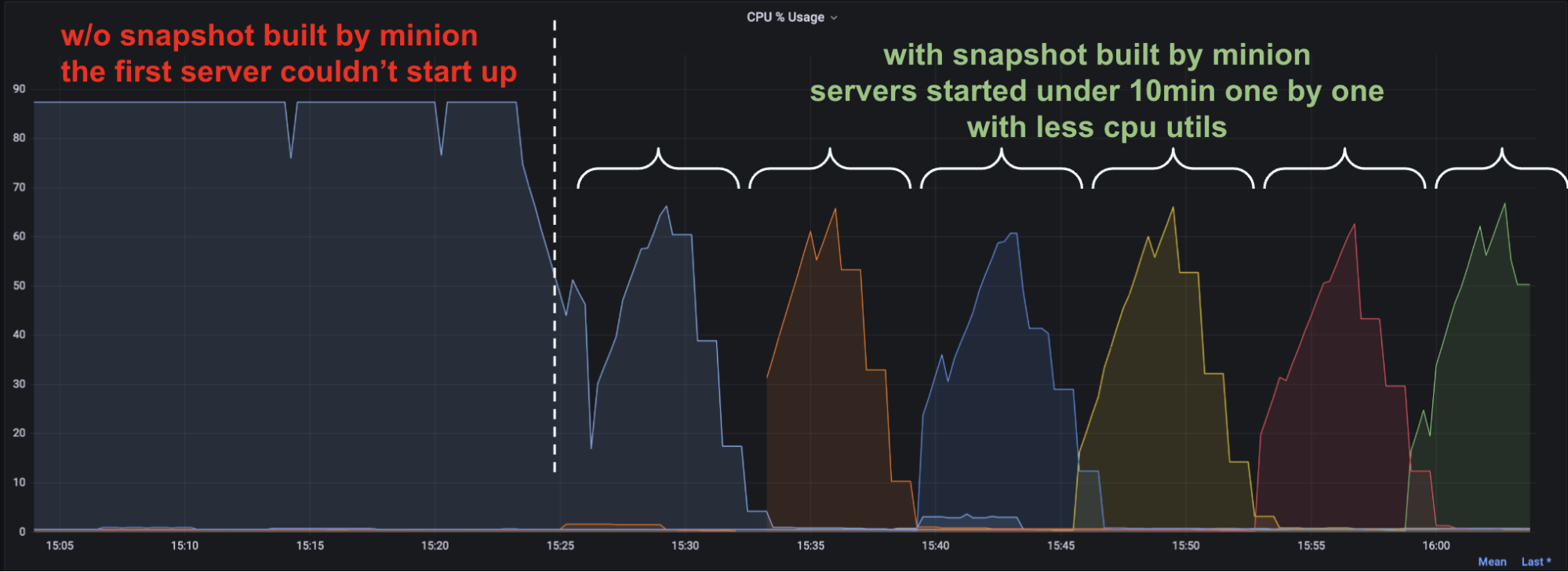 Then we enabled this new minion task to prebuild upsert metadata for all table partitions. With the Pinot minion framework, we could use many workers to build snapshots in parallel to reduce the overall time. Once the snapshot was ready, the servers could use it to get restarted in less than 10 minutes. As shown in the figure below, the cluster rolling restart finished quickly.