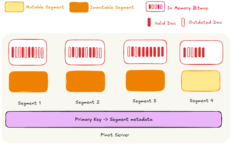 - Upsert Metadata: This is a map from primary key -> segment id which tracks the current segment which has the valid doc for a given primary key.