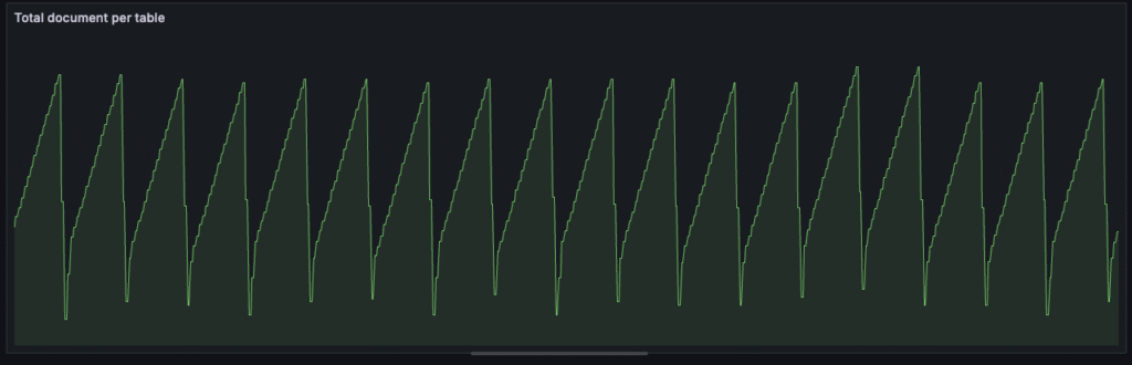 Below graphs show the results with a fixed number of primary keys being continuously updated. It is seen that the total primary key count (as measured by queries) is constant while the total number of documents follows a see-saw pattern. The total number of documents increases as data is updated and then falls to a baseline as compaction runs