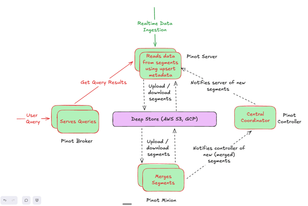 Pinot’s upsert support is designed for real-time event ingestion. When a new record arrives, it marks older records with the same primary key as obsolete via in-memory bitmaps. The old records, though filtered from queries, still live in the table segments.