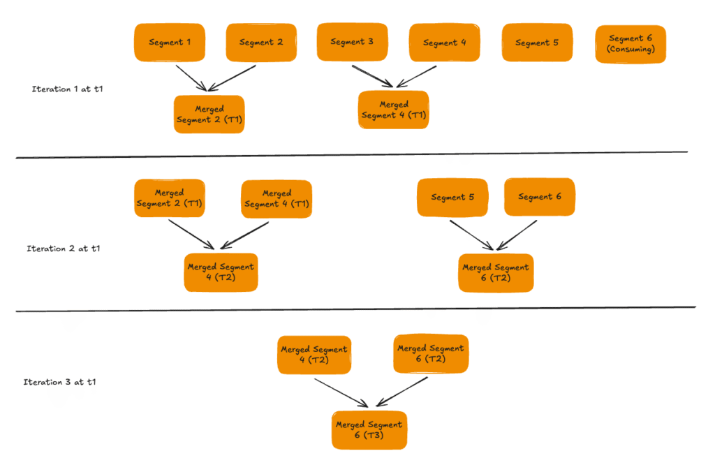 - Merges / compacts them into new segments. The decision to merge / compact a segment is based on the desired output size of a segment.
