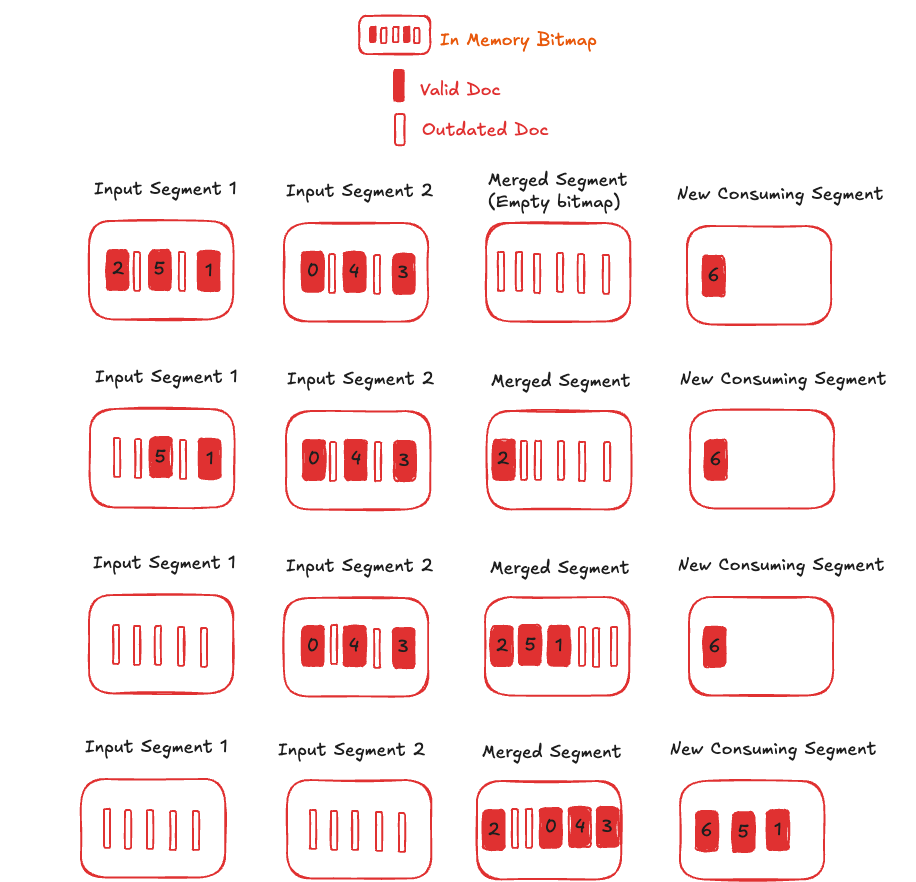 The merged segment is generated from Input Segment 1 and Input Segment 2. As documents are individually loaded, the corresponding bitmaps are unset in the input segments and set in the merged segment. If the primary key is present in a new consuming segment, it is unset in the older input / merged segment.