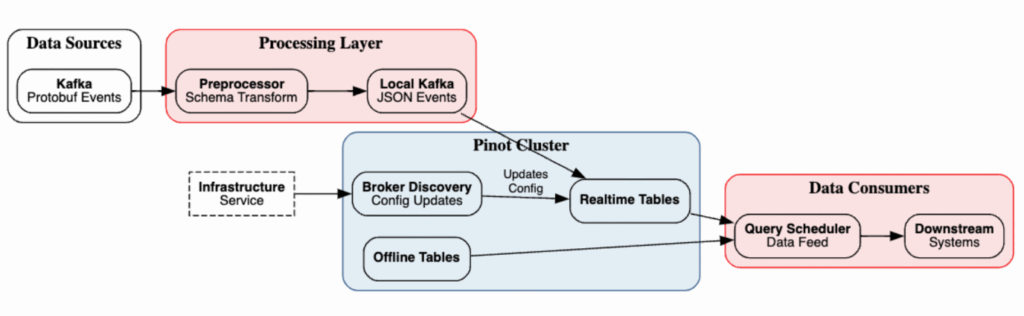 - Data consumers are the downstream services and dashboards. Some query Pinot directly, while others rely on the continuous feed via the query scheduler.