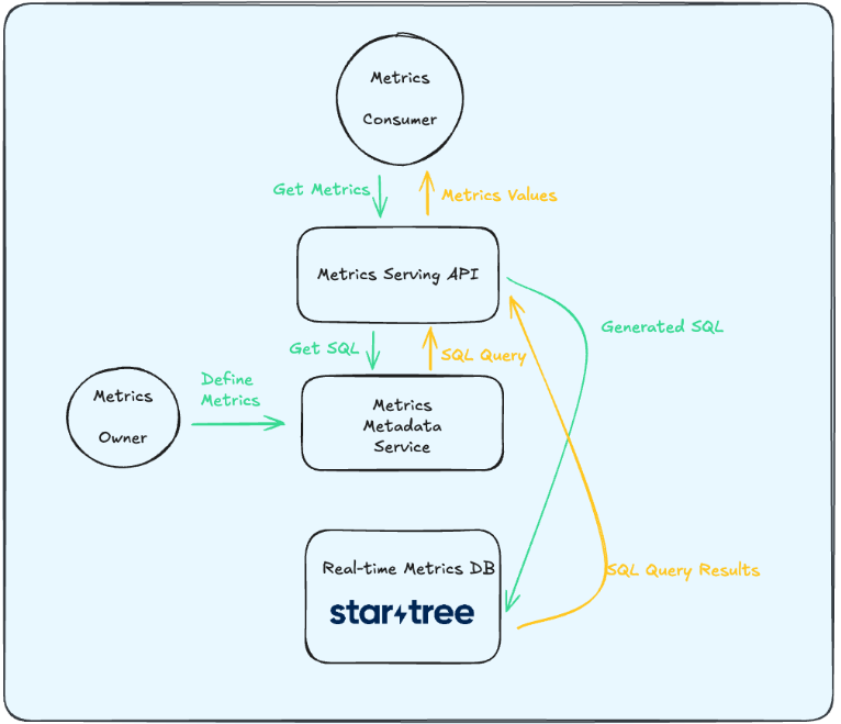 Serving a metric now follows a consistent pattern. A request hits the serving API, which consults the metrics metadata service to determine how to construct the SQL query. SQL is executed on Pinot, and the results are returned. Reusable metrics contribute to consistency and scale.