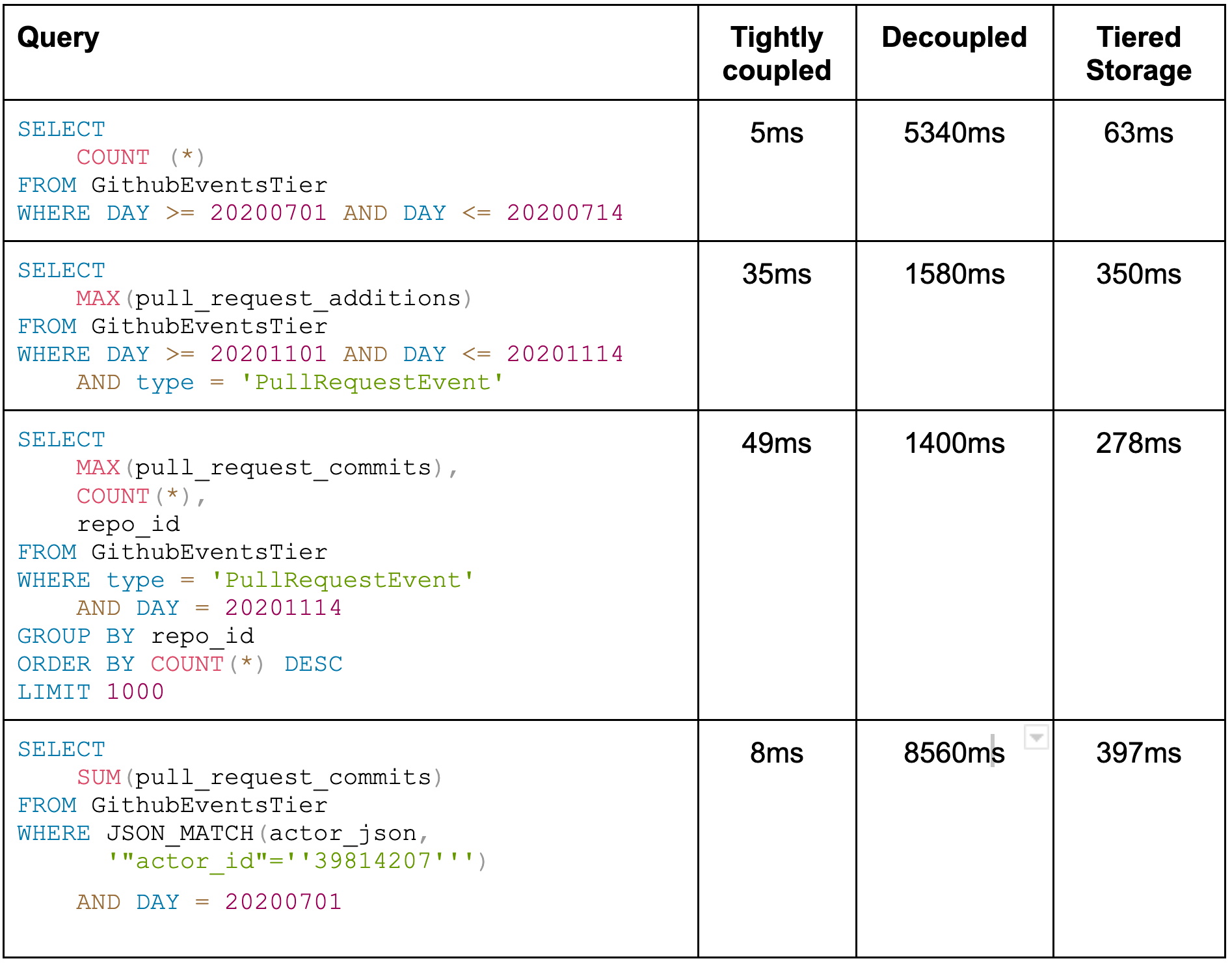- Compelling Query performance: As we saw in the benchmarks above, you still get the same lightning-fast query performance for fresh data residing in local storage and slightly elevated but ballpark query performance for remote data.
