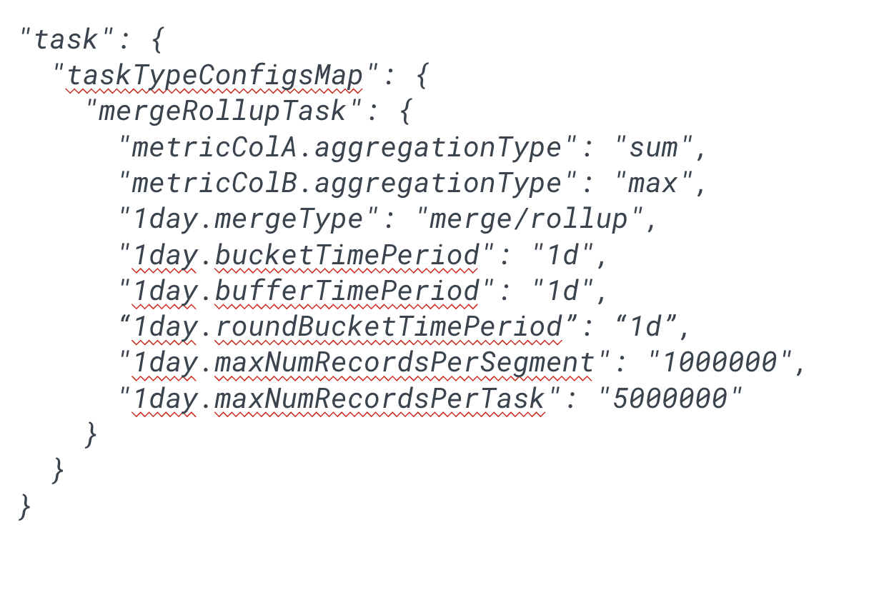 Segment merge addresses the problem of having many small segments being added regularly to a table. These can be combined to form a few big segments, thus improving both query performance as well as storage utilization. During merge, you can also enable roll-up of data so that recent segments have fine granularity of data while older segments have coarser granularity, thus saving space even further. Each column can be configured to be aggregated independently in the rolled up segments, as illustrated below: