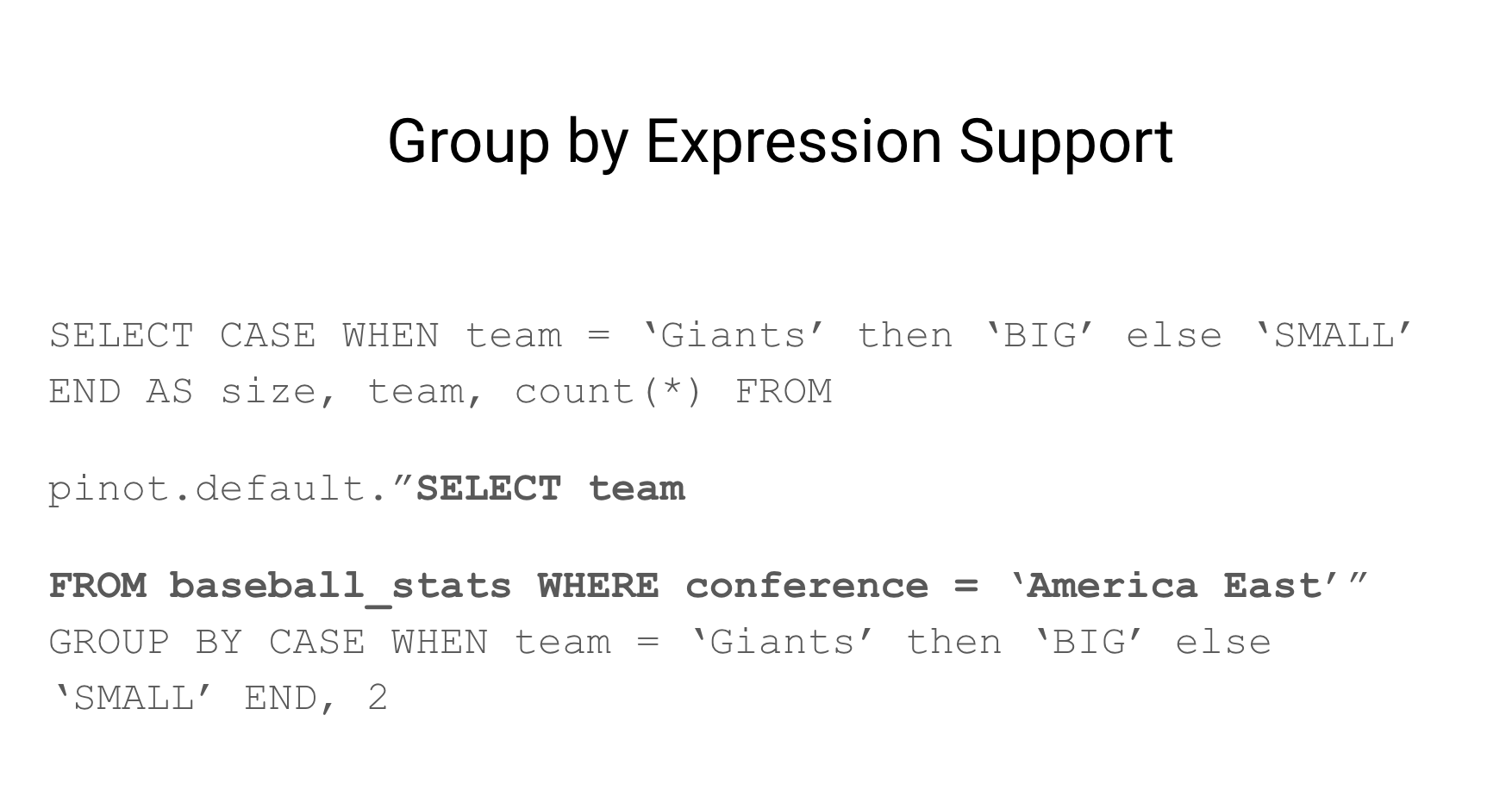 Aggregation pushdown was the major change we contributed this year. The connector now supports complex group by and other expressions in addition to simple column references. The connector will convert the query into a broker request. Instead of aggregating in Trino, the engine will push the aggregation to the broker, which was for us a major win in terms of performance.